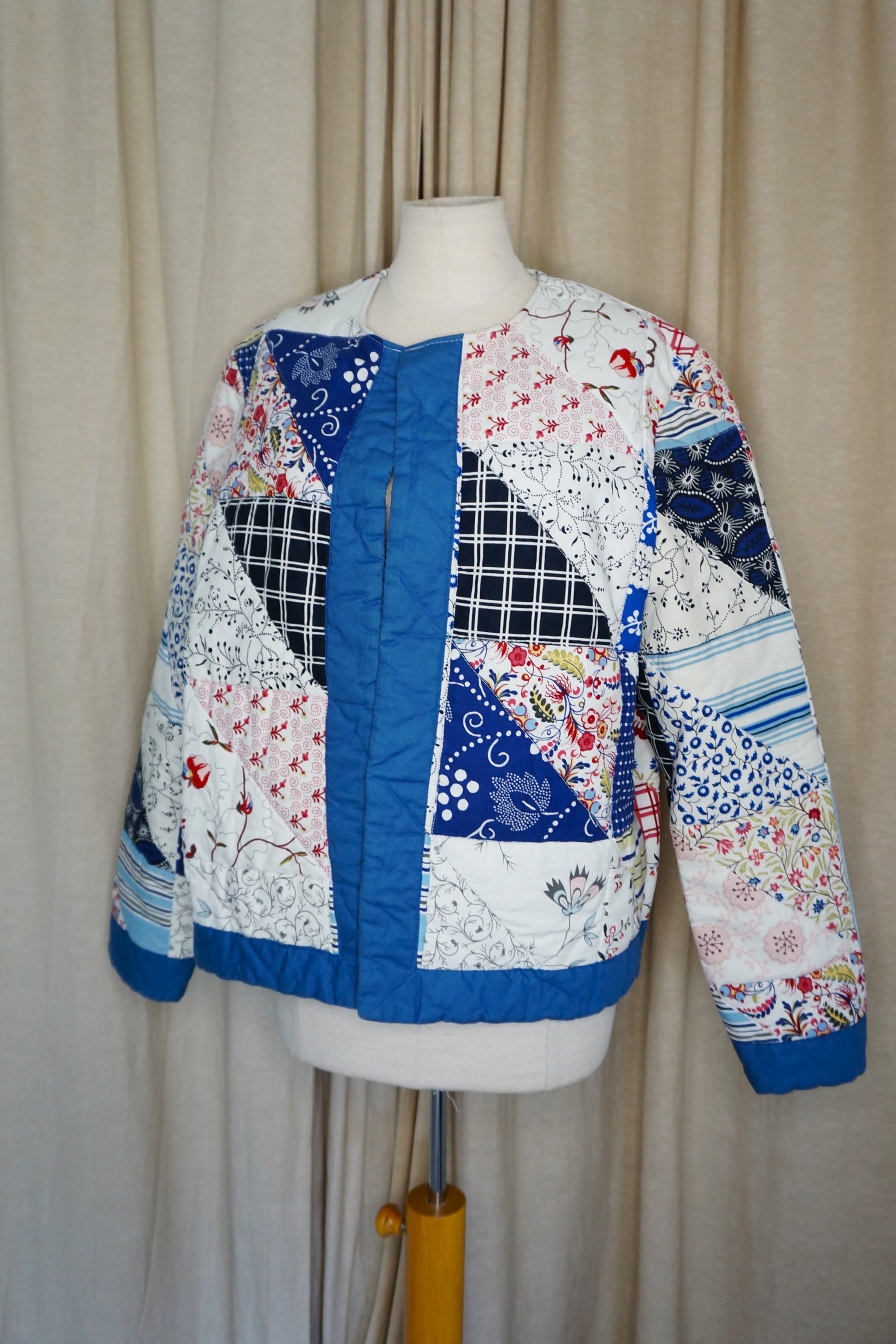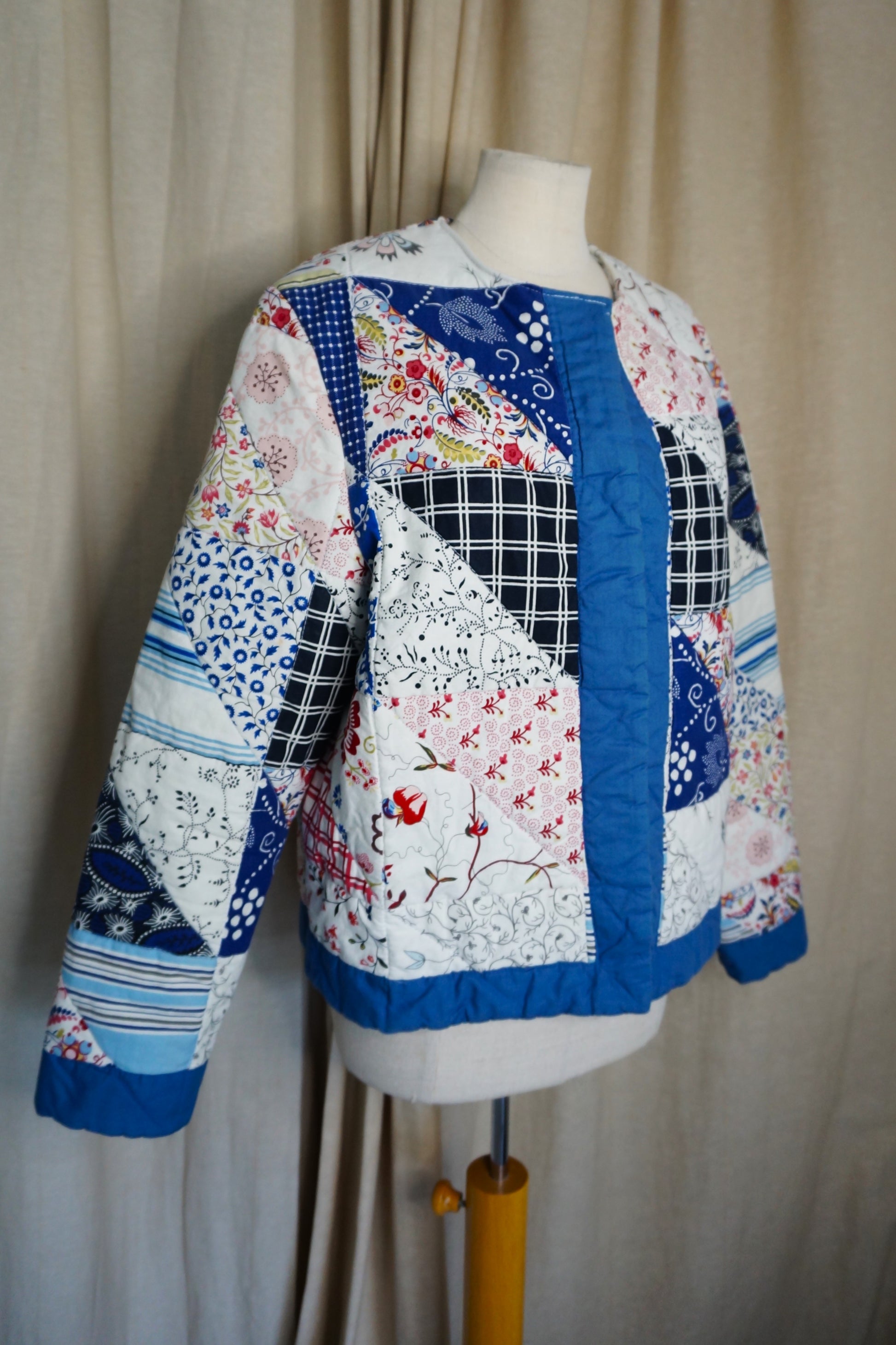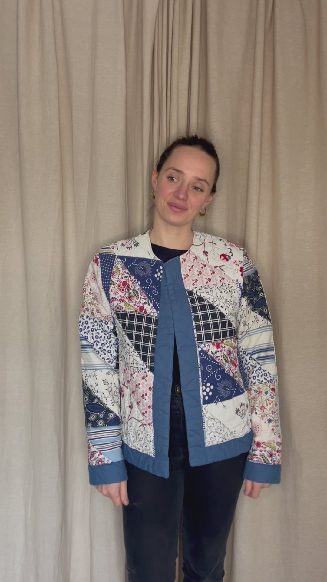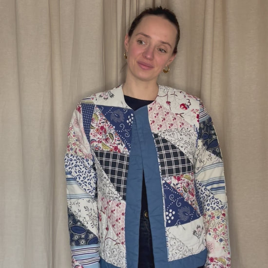 Kurze, kastige Jacke aus Baumwolle – Patchwork in Blau & Weiß mit floralem Muster | Unikat