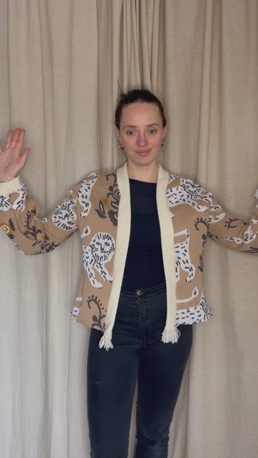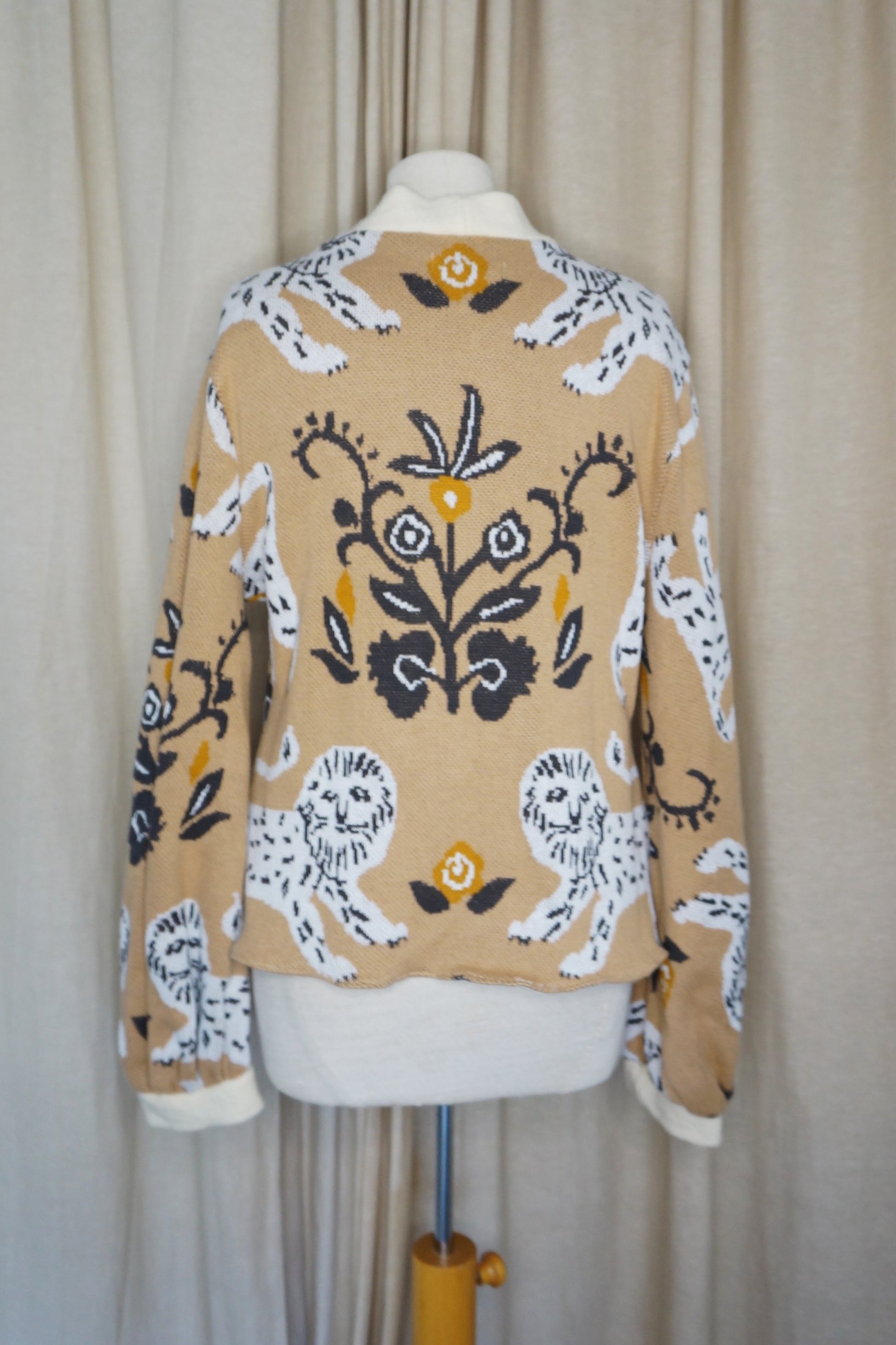 Kurzer Kimono aus Baumwolle – Beige mit Löwenmotiv | Unikat