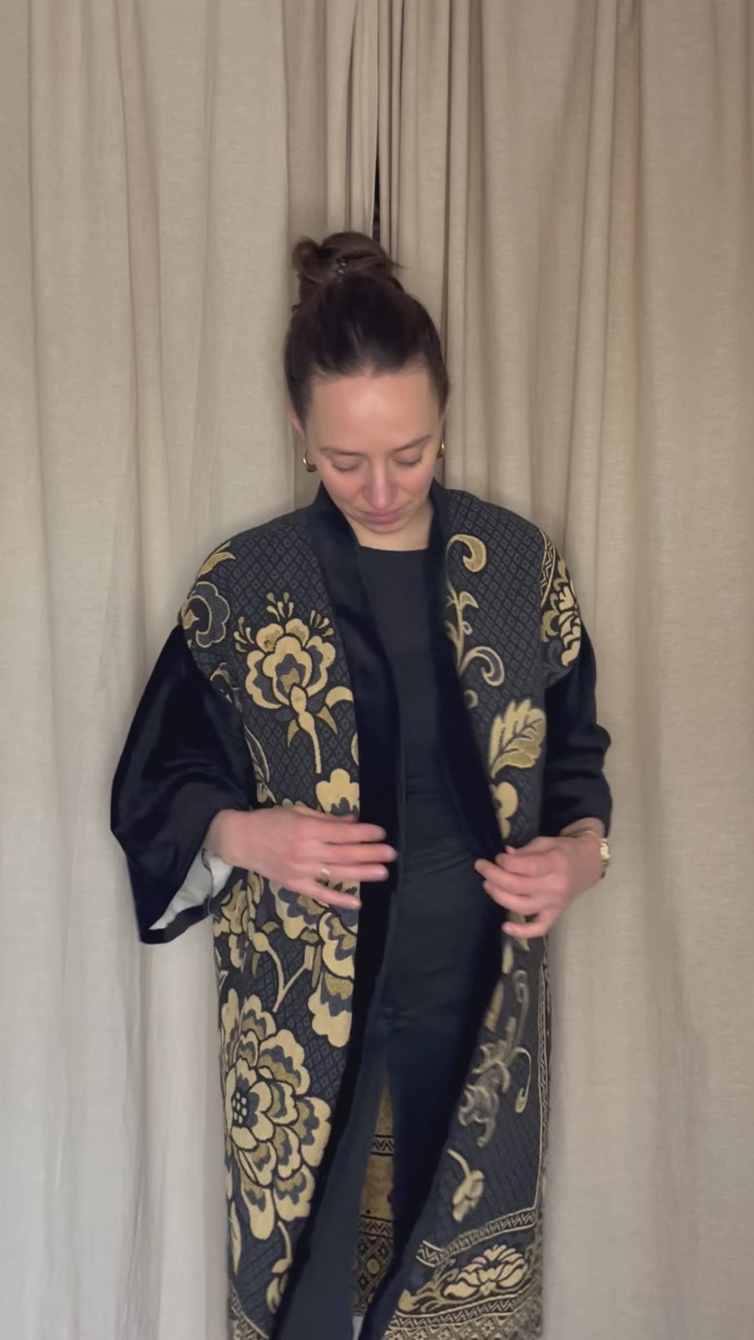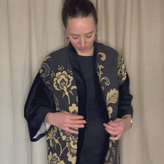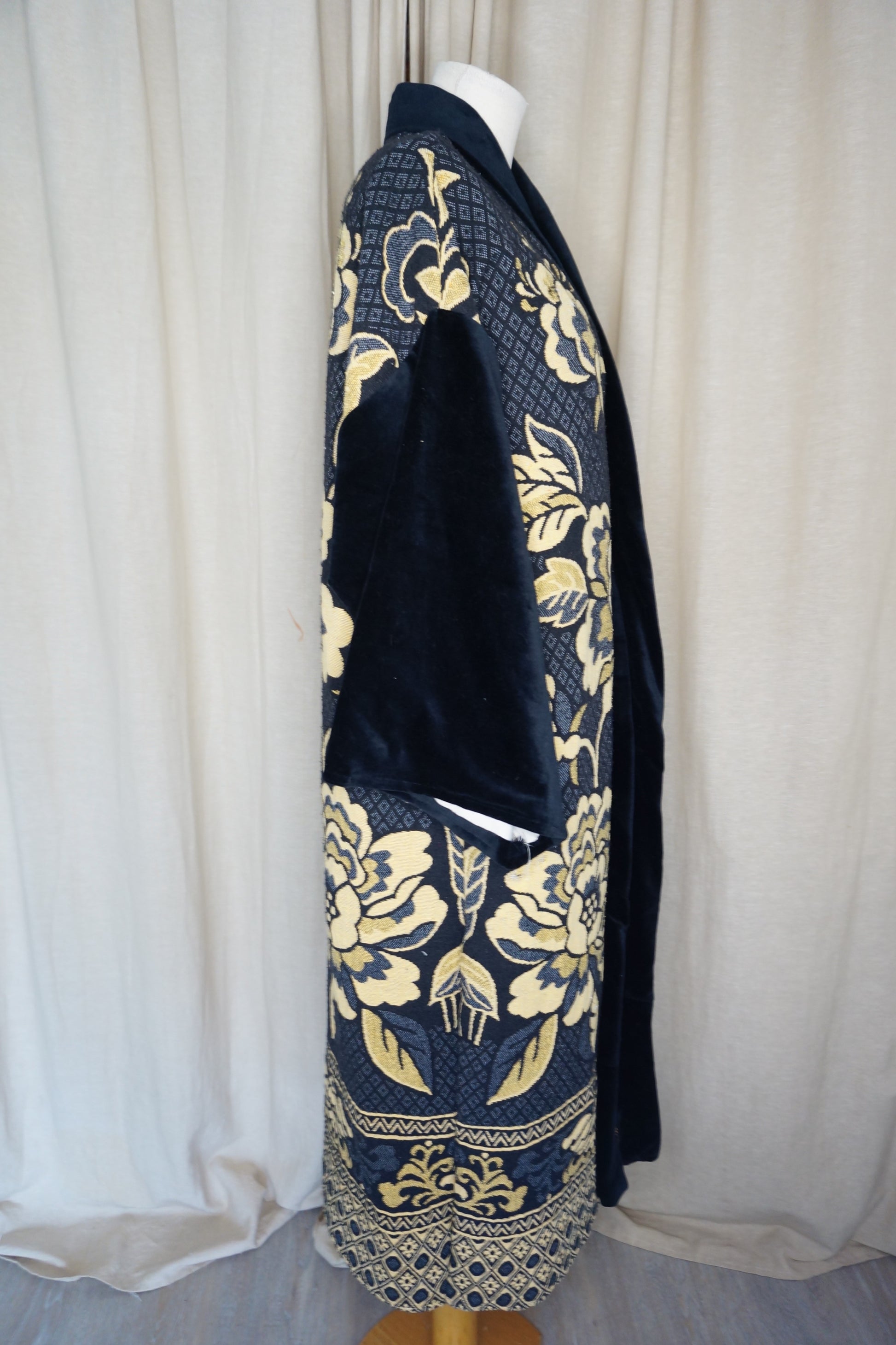 Langer Kimono – Schwarz & Gold florales Muster | Unikat